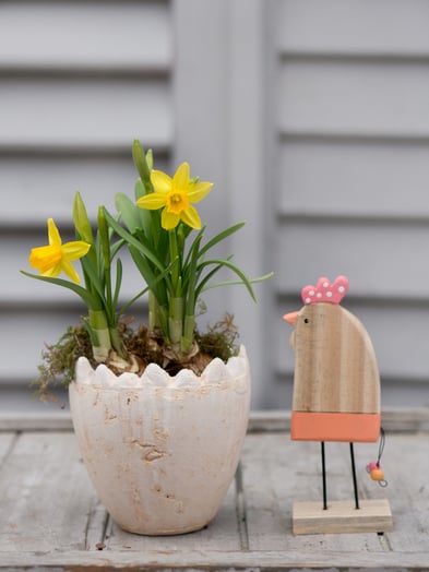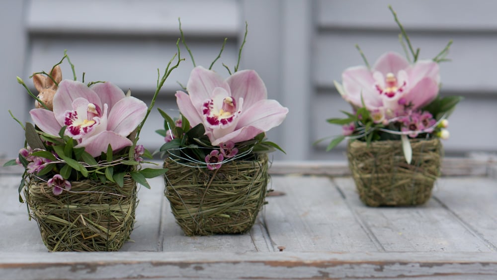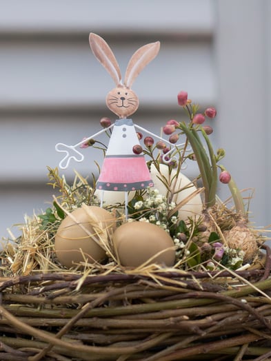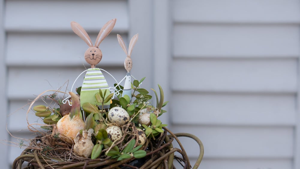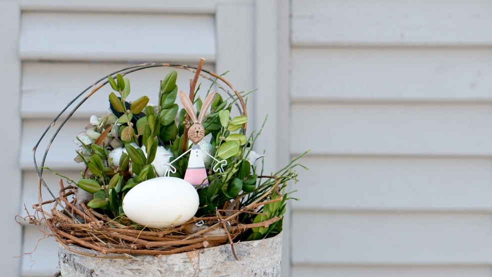 Zwischen leuchtenden Blumen und schlichten Kränzen aus Naturmaterialien haben sich Ostereier in zarten Farben versteckt. Und wer genau hinschaut entdeckt vielleicht sogar den Osterhasen.